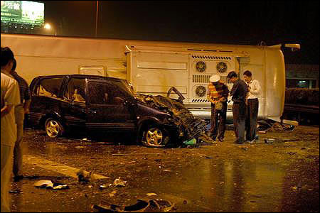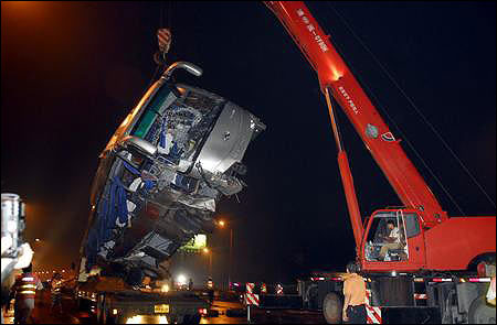 傷者被全部送走后,警察開始指揮吊車和清障車清理現(xiàn)場。晚9時50分,旅行車被吊上清障車拉走,晚10時15分,大客車被吊上另一輛大型清障車。記者晚上10時30分離開時,警察還在對現(xiàn)場進(jìn)行勘查。